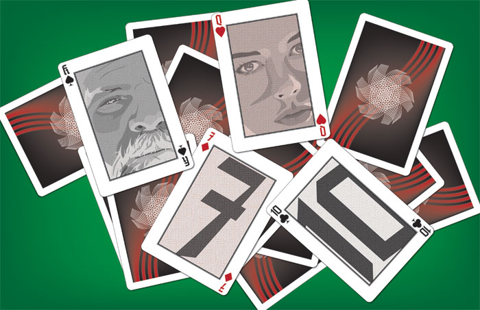 This project was enjoyable because it was an opportunity to learn from a previous experience of illustrating a portrait and getting too bogged down in the fine details. I felt like I learned from the process and was really pleased with my card designs. Additionally, the presentational layout of the piece adds to the interest above and beyond the design of the cards themselves. This piece was created in Adobe Illustrator.